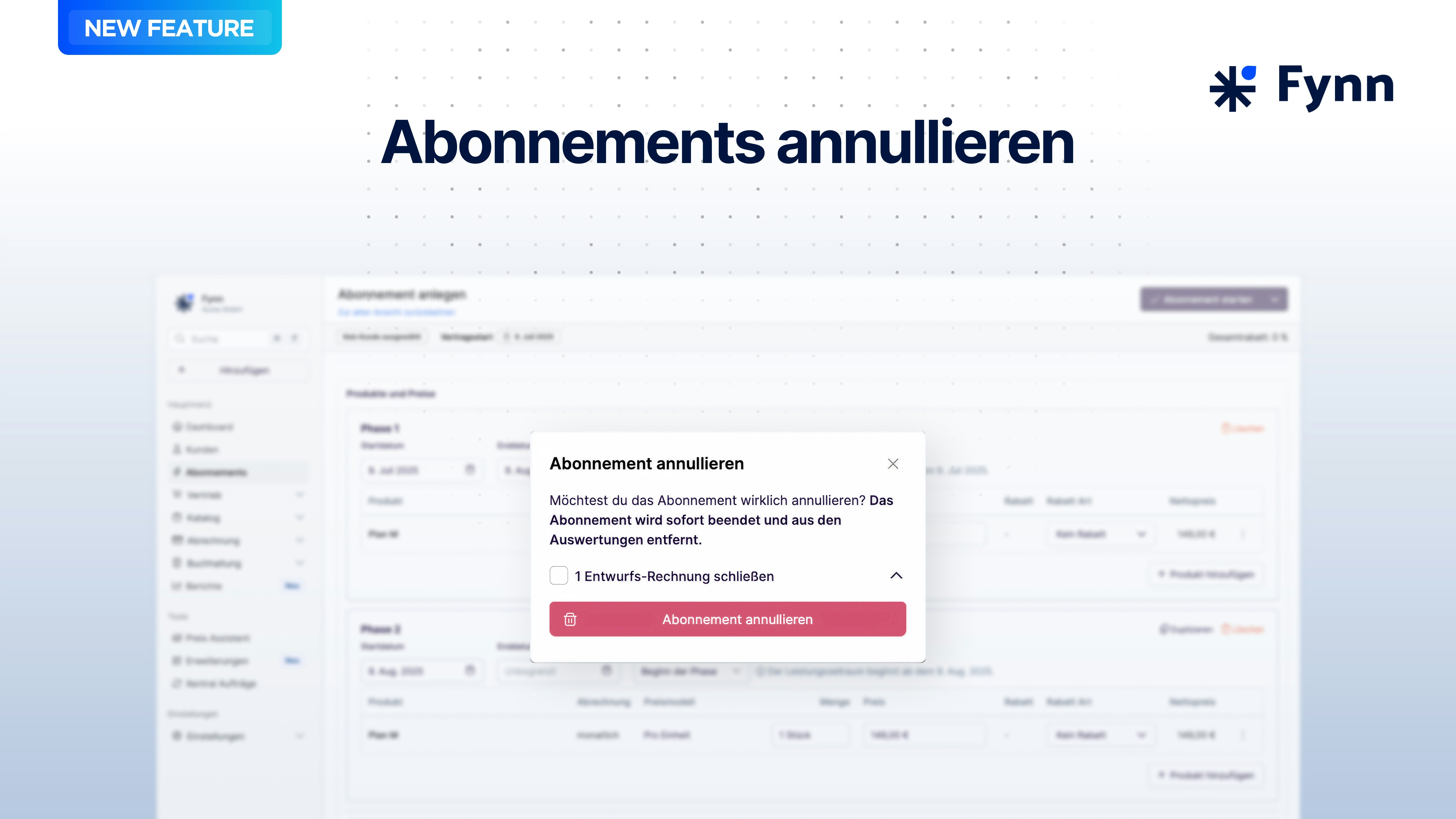 Es ist nun möglich, das Verhalten bei Kündigung während der Testphase festzulegen. Damit kannst du festlegen, ob das Abonnement sofort oder zum Ende der Testphase beendet wird.Weitere Details in der Dokumentation10. Oktober 2024
