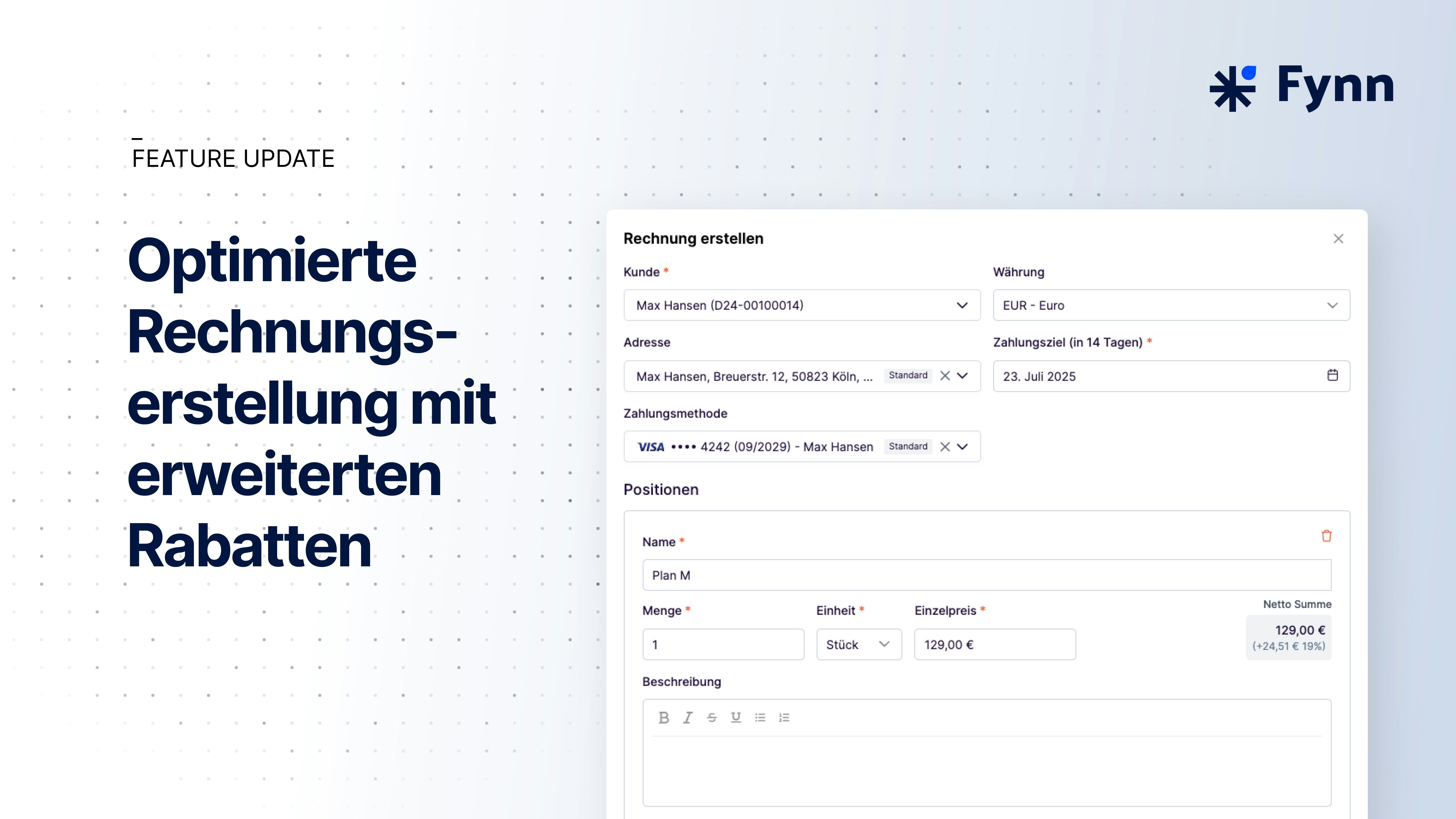Kunden überweisen gerne mal mehrere Rechnungen in einer Überweisung, anstatt für jede Rechnung eine separate Überweisung zu tätigen.Mit dem aktuellen Update ist es nun möglich, dass Fynn automatisch erkennt, welche Rechnungen in einer Überweisung beglichen wurden und die Zahlungen entsprechend zuordnet.14. Mai 2024