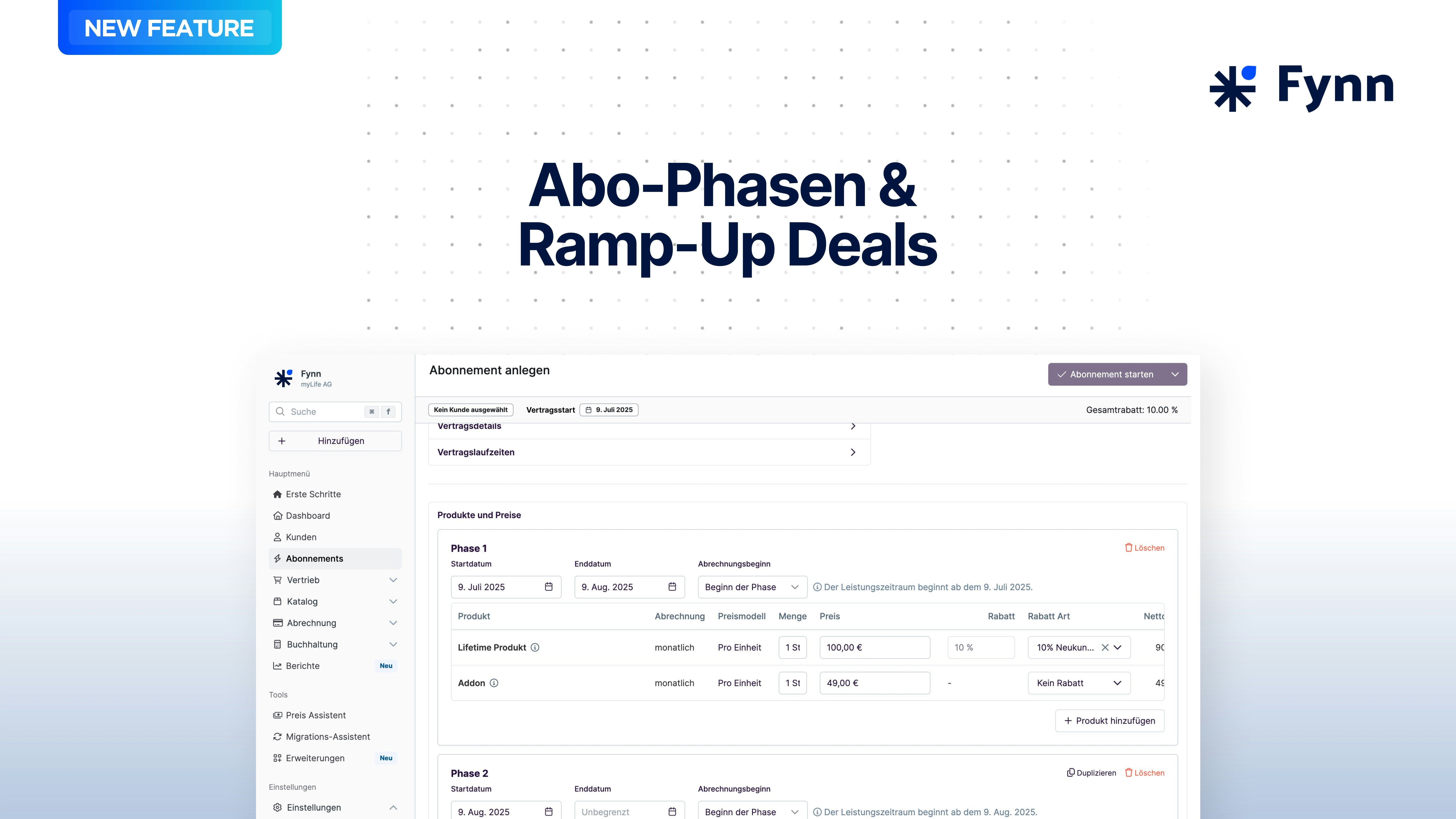 Abonnements die bspw. verspätet erstellt wurden, können nun auch mit einem Abrechnungsstart in der Vergangenheit erstellt werden. Bisher war es so, dass jedes Abrechnungsinterval einmal nächtlich abgerechnet wurde, was widerrum zu mehreren Rechnungen und verzögerten Abrechnungen führte.Bisher Abo-Anlage am 18.12.2024Abo-Start am 01.10.2024Bei Abo-Anlage wird der 01.10. - 31.10. abgerechnet.Am 19.12. wird der 01.11. - 30.11. abgerechnet.Am 20.12. wird der 01.12. - 31.12. abgerechnet.NeuBei Abo-Anlage am 18.12.2024 wird in einer Rechnung der Zeitraum 01.10. - 31.12. abgerechnet, ohne das dies in mehrere Rechnungen aufgeteilt wird. Dies erleichtert die Pflege und Nachvollziehbarkeit erheblich.